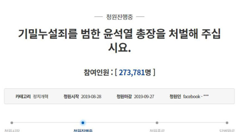 '기밀 누설죄를 범한 윤석열 총장 을 처벌해 주십시오'라는 제목으로 지난달 28일 에 올라온 이 청원 에는 7일 오후 3시 30분 현재 27만3천여명이 참여했죠..