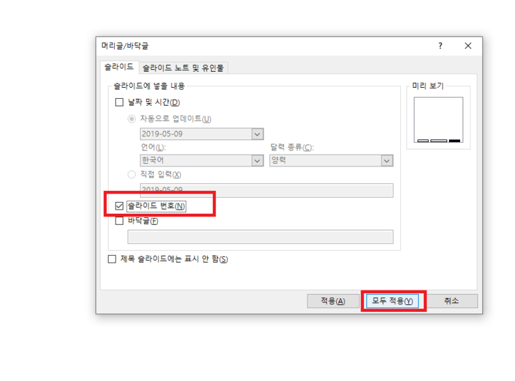 바로 [슬라이드 번.호] 의 박스를 체크해 주고 [모두 적용]을 클릭해 주면 되는데요~