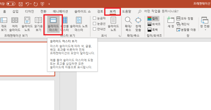 먼저 상단의 리본 메뉴에서 [보기] 를 클릭한 뒤 아래에 있는 것들 중 [슬라이드 마스터]를