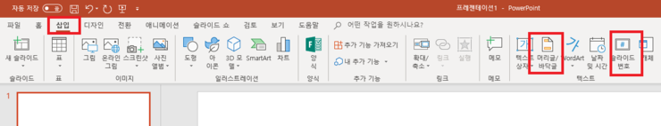 소메뉴가 노출이 되는데요 그 중에서 [머리글/바닥글] 혹은 [슬라이드 번.호] 를 눌러줍니다
