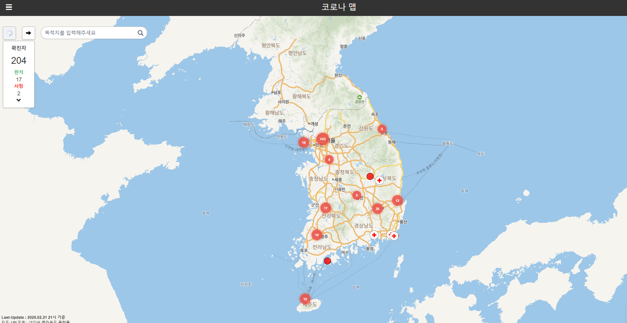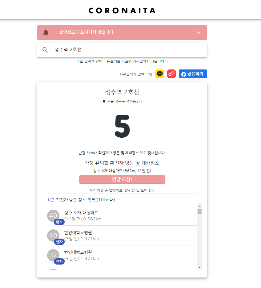 이렇게 코로나 맵이 먼저 인기를 끌고 나니 새로운 사이트가 나왔습니다. 바로 코로나 있다(coronaita)입니다. 전 코로나 맵보다 조금 더 쉽게 확인할 수 있는 점이 장점입니다.
