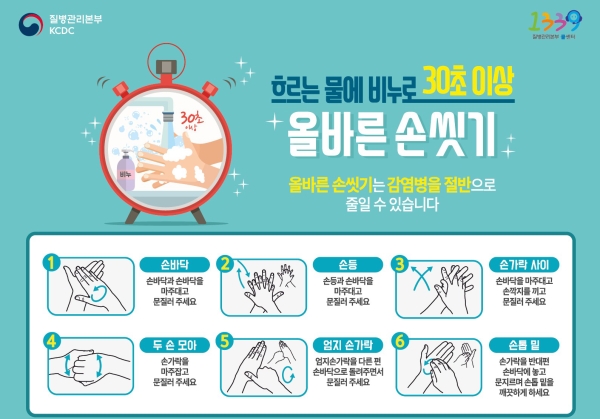 많은 사람들이 모인 곳을 다녀오거나 밖에 나갔다 오면 손 씻기가 가장 중요합니다.. 손을 통해 얼굴(눈, 코, 입 등등)을 통해 감염이 일어나기 때문입니다. 질병관리본부에서 내놓은 예방 책중 하나이면서 대부분의 사람들이 알고 있는 방법인 손 씻기는 비누로 씻는 것보다 중요한 것이 손을 씻는 시간이라고 합니다.